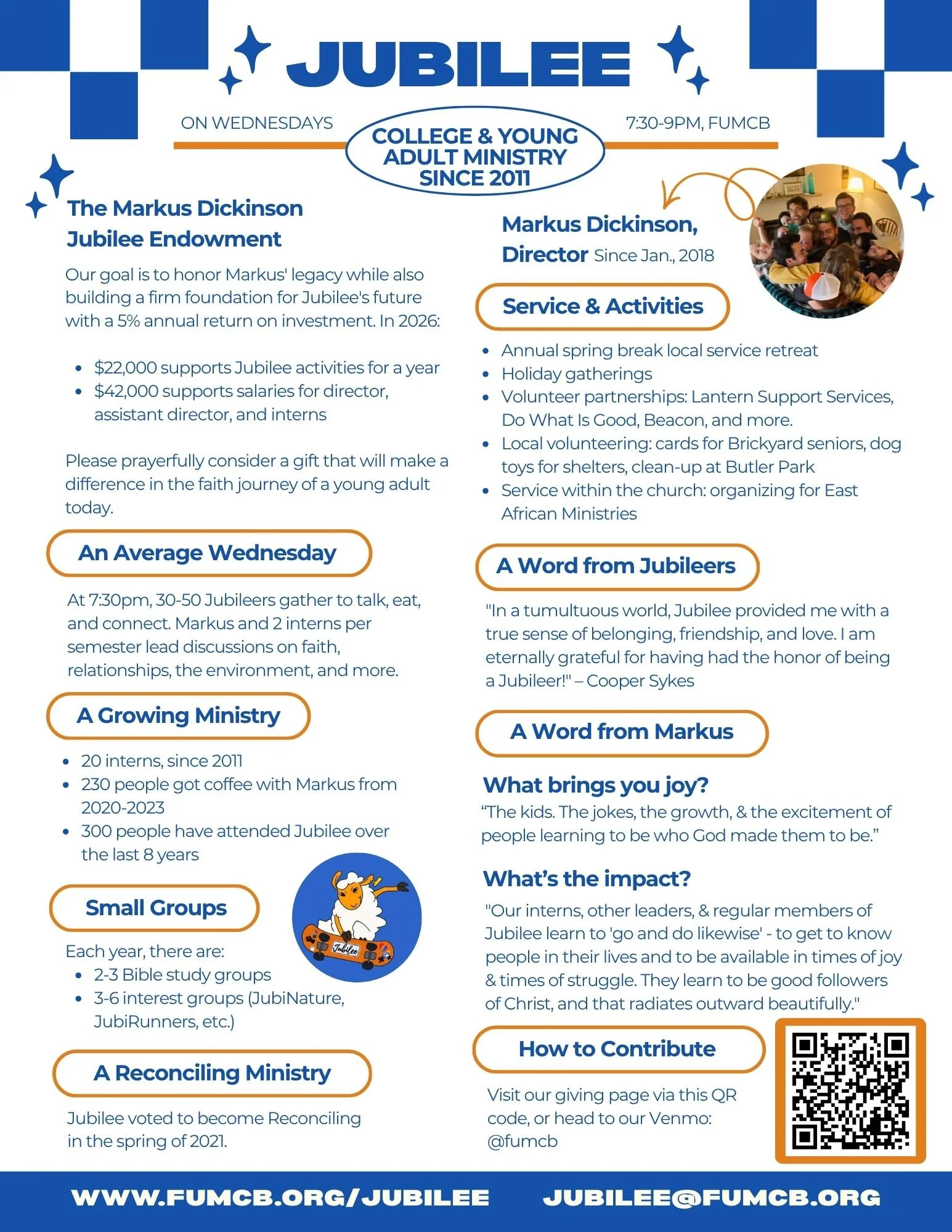 We are so grateful for your time spent reading this e-mail and for all the love that you’ve shared with our FUMCB and Jubilee community throughout the years! The Markus Dickinson Jubilee Endowment is only possible through the care that you have put into FUMCB and its ministries, and we hope that you will consider supporting us in ensuring that Jubilee can continue to provide joy to more phenomenal humans for many years to come.